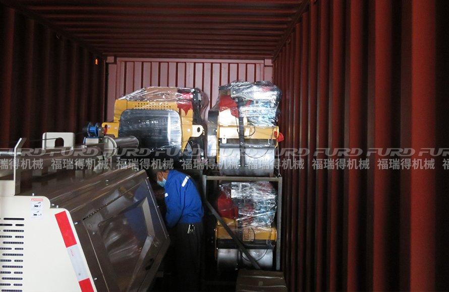 9月3日,福瑞得機(jī)械6臺手扶雙輪壓路機(jī)、和2臺9米移動(dòng)燈車裝車出口非洲。