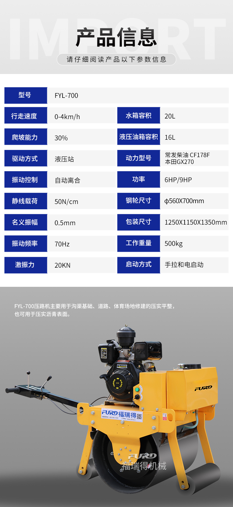 主要用于溝渠基礎(chǔ),道路,體育場(chǎng)地的壓實(shí)整平, 也可用于壓實(shí)瀝青表面的作業(yè)。
