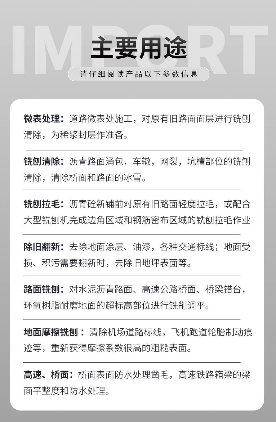 用于橋面鋪設(shè)瀝青或車間舊的混凝土地面重新攤鋪混凝土之前,清除水泥浮漿以及鏟平拉毛, 也用于清除建筑施工中的堅(jiān)硬灰渣。