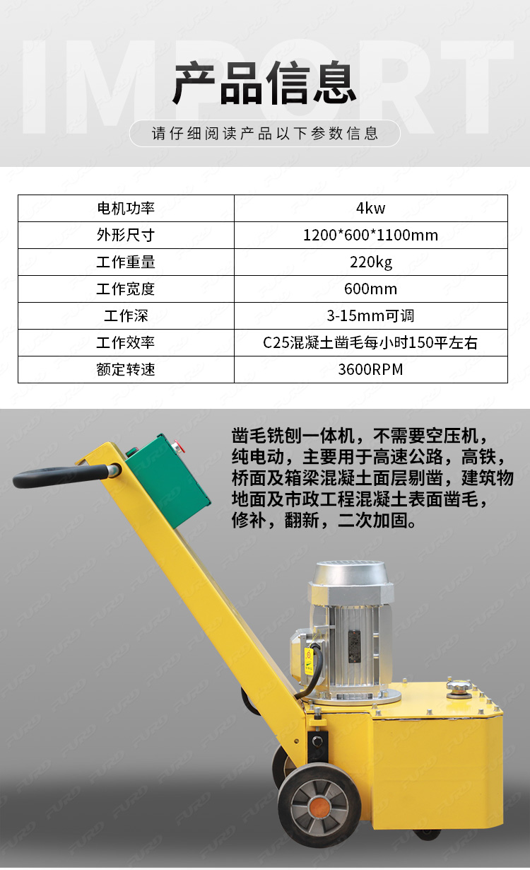 鑿毛銑刨一體機(jī),不需要空壓機(jī),純電動,主要用于高速公路,高鐵,橋面及箱梁混凝土面層剔鑿,建筑物地面及市政工程混凝土表面鑿毛,修補,翻新,二次加固。